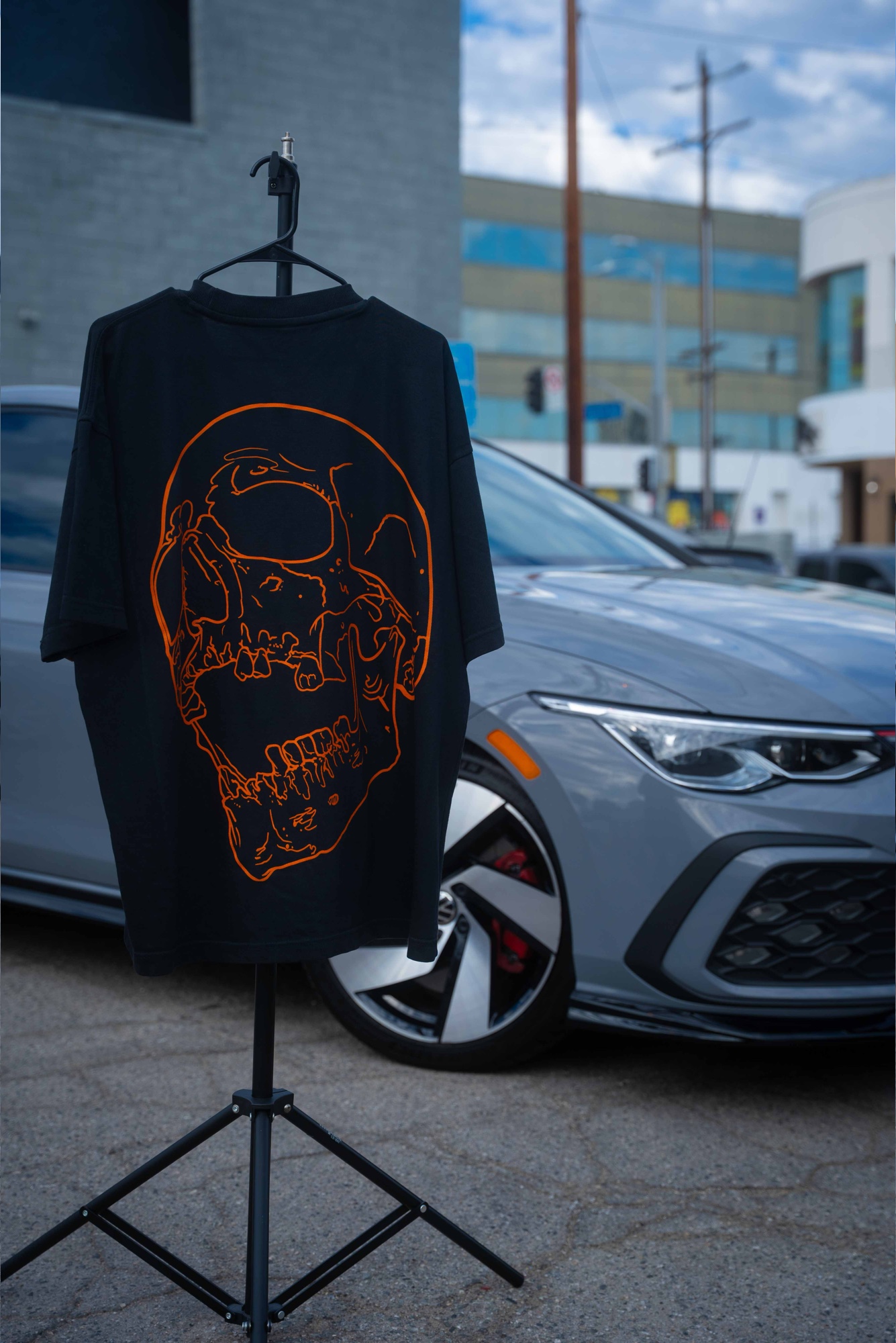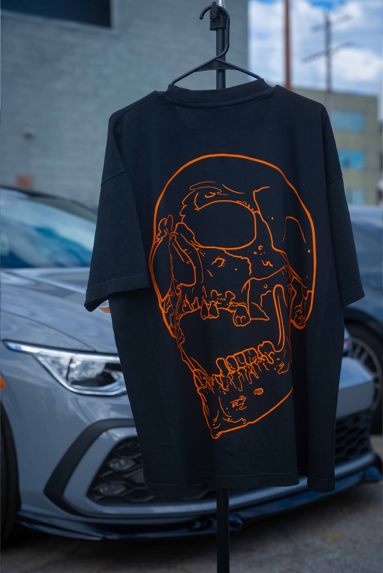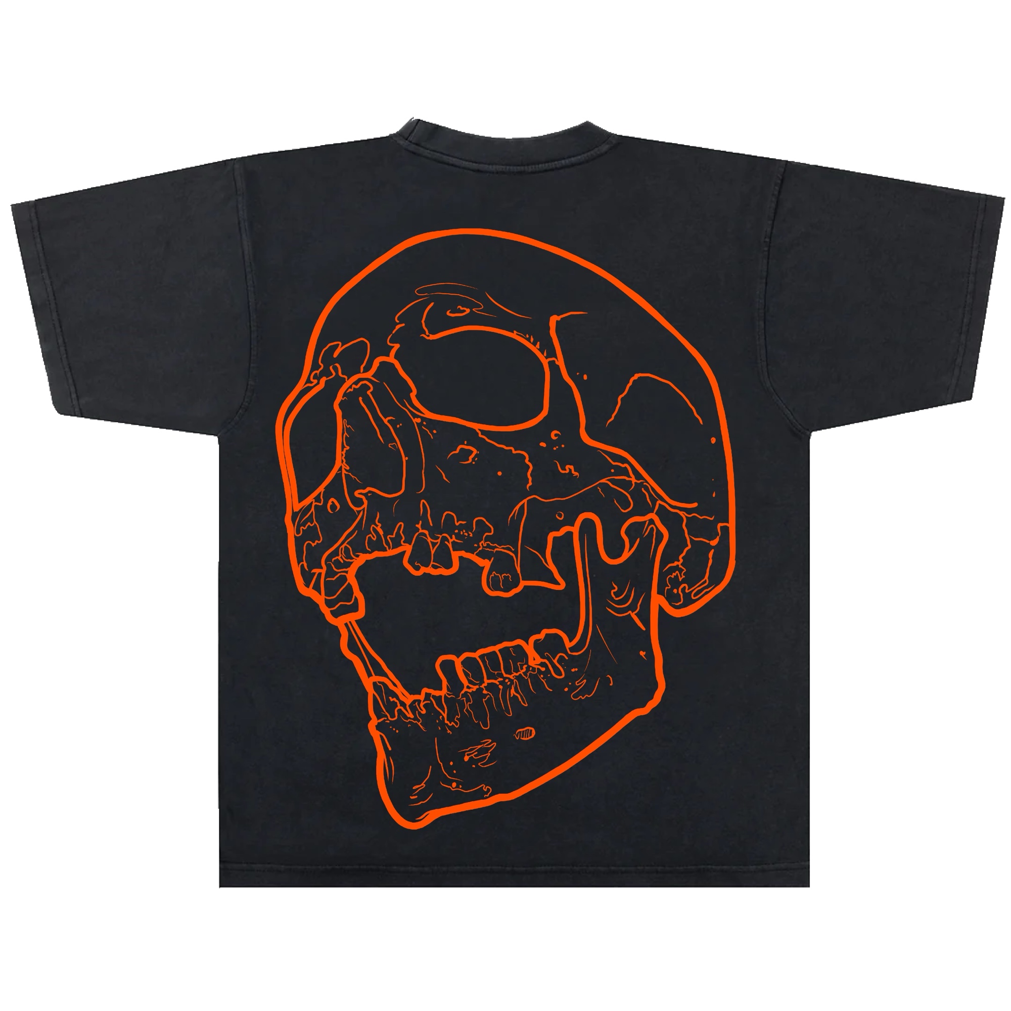The Skull T-Shirt in black blends clean streetwear with tattoo culture. Up front is a minimal orange “Los Angeles” chest print logo; on the back, a bold oversized skull line-art drawn by Levgen, a tattoo artist working between Los Angeles, New York, and Berlin.